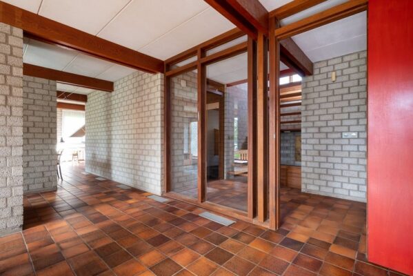 Op een rechthoekige kavel, die aan drie zijden wordt begrensd door straten (Oosterweg, Schoutelaan en Clusiusweg) bouwde Kleinjan een villa die geheel terecht de architectuurgids van de provincie Groningen haalde. In die gids staat dat de woning de grootste kwaliteit heeft achter de entree. De meeste mensen zien echter alleen de buitenkant. Nou weet ik toevallig dat de binnenkant en de buitenkant van deze woning veel met elkaar te maken hebben, door de toepassing van schoon metselwerk en hout. In de jaren ’70 gebruikten architecten graag (kijk bijvoorbeeld naar Herman Hertzberger) een betonsteen in het zicht, omdat die zo mooi strak past in de mathematische opzet van een plattegrond.